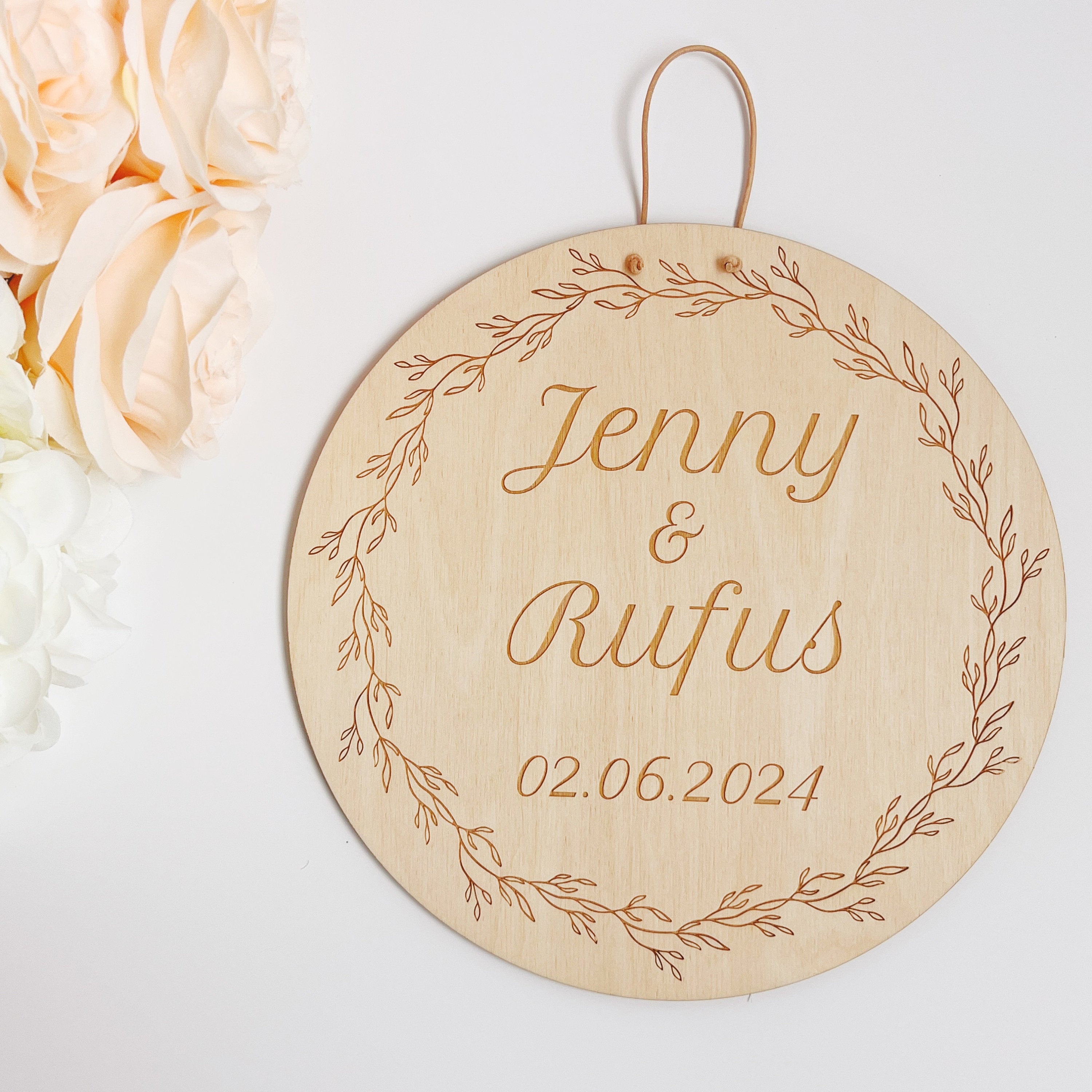 Das Design umfasst eine filigrane Gravur der Namen des Hochzeitspaares und das Datum des besonderen Tages, was es zu einem einzigartigen und persönlichen Geschenk macht. Der zarte Kranz umrahmt die Schrift stilvoll und verleiht dem Schild eine elegante Note.