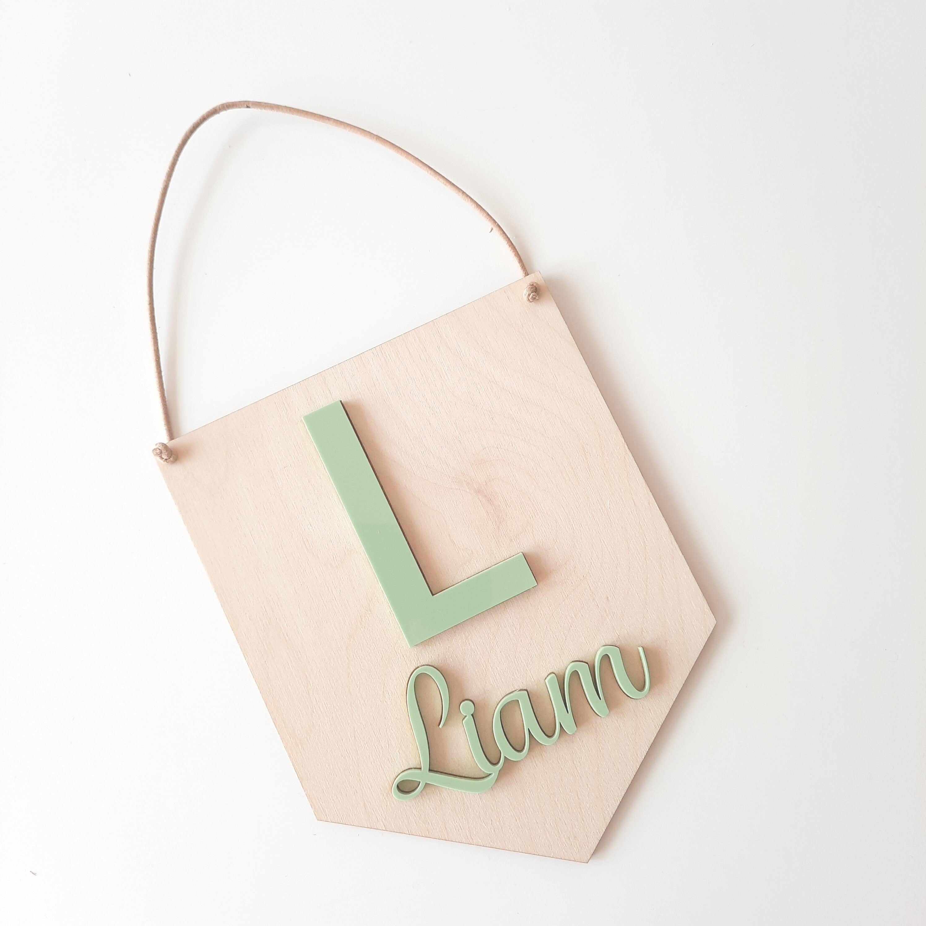 Dieses hübsche Holzschild eignet sich wunderbar als Wanddekoration für ein Kinderzimmer oder Babyzimmer. Du kannst aus mehreren Größen auswählen (siehe Optionen). Auch bei den Farben für den Buchstaben und den Namen hast du mehrere Optionen: