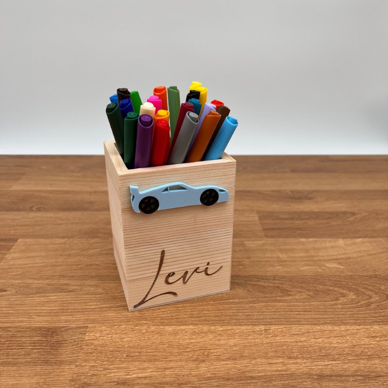 Der Stiftehalter wird mit deinem Wunschnamen und deiner Wunschfarbe für das Motiv (Rennauto) personalisiert. Die Reifen des Rennautos sind immer schwarz und nicht personalisierbar. Die verfügbaren Farben siehst du im letzten Artikelfoto.  Teile uns über die entsprechenden Felder deinen Personalisierungswunsch mit und verleihe dem Stiftehalter somit eine persönliche Note.