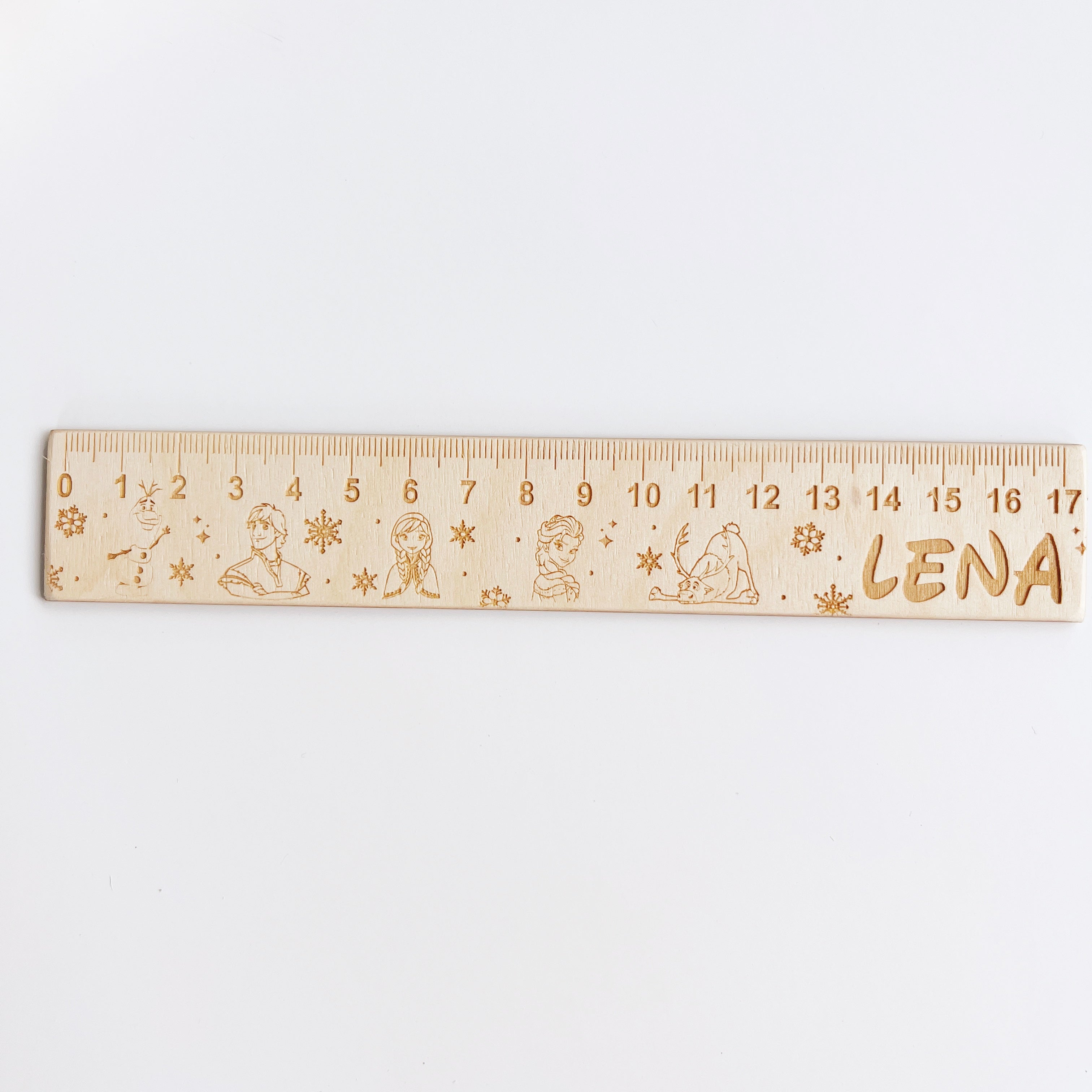 Das Lineal ist liebevoll mit winterlichen Motiven und Charakteren aus einem beliebten Zeichentrickfilm graviert. Es zeigt detaillierte Abbildungen von Figuren wie Olaf, Kristoff, Anna, Elsa und Sven, die von Schneeflocken umgeben sind. Am rechten Ende des Lineals ist dein Wunschname eingraviert, was dem Lineal eine persönliche Note verleiht und es zu einem idealen Geschenk für Kinder macht.
