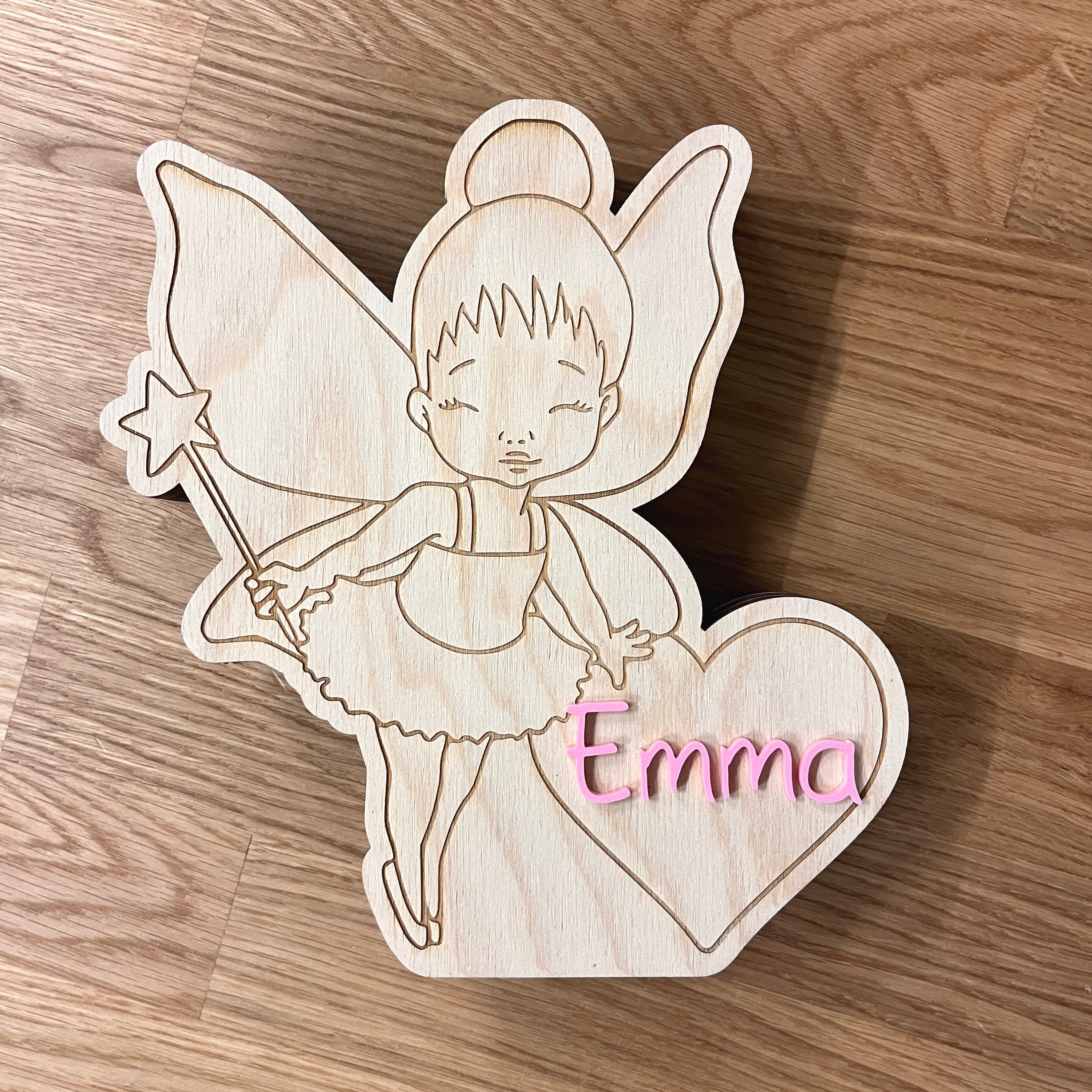 Dies ist eine personalisierte Spardose für Kinder aus Birkenholz, 100% handmade. Jede Spardose hat einen Schlitz für Scheine und Münzen, der groß genug ist, sodass man ganz leicht Geld hineinstecken kann. Auf der Rückseite der Spardose ist außerdem ein abnehmbarer Plastikstecker, sodass man diese bei Bedarf auch leeren kann.